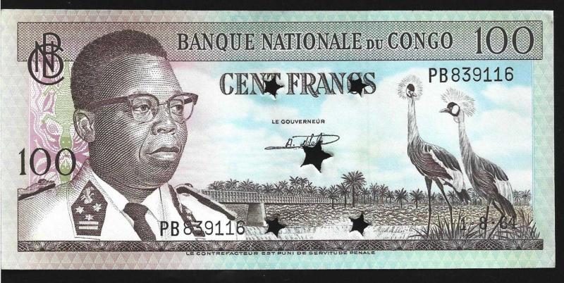** KONGO DEMOKRATİK CUMHURİYETİ ( 100 * FRANCS ) 1964 * İPTAL DELİKLİ - ÇİL ALTI, 24 gün önce satışa sunulmuştur.