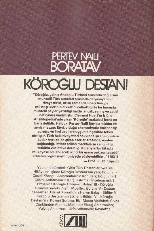 KÖROĞLU DESTANI, HAZIRLAYAN: PERTEV NAİLİ BORATAV tarafından kaleme alınmıştır. Kitap 1984 yılında ADAM YAYINLARI tarafından [İSTANBUL] yayınlanmıştır. 264 sayfadır. KÖROĞLU DESTANI adlı eser Türkçe dilindedir.