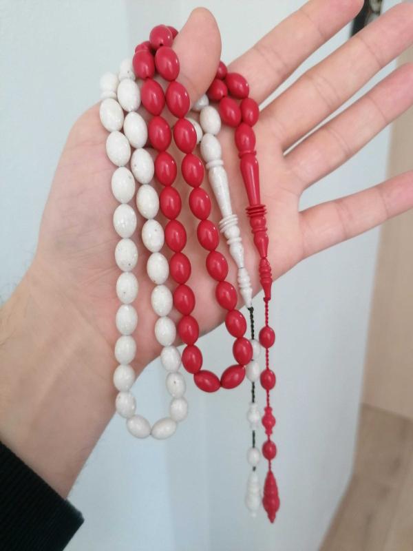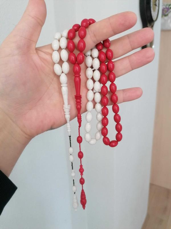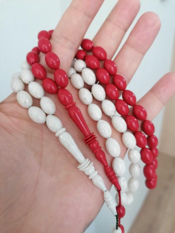 Kırmızı ve Beyaz ORJİNAL Koryan Mermeri, Sistem Püsküllü ve Halkalı İmameli İkiz Tesbihler. Fiyat İkisi İçindir.