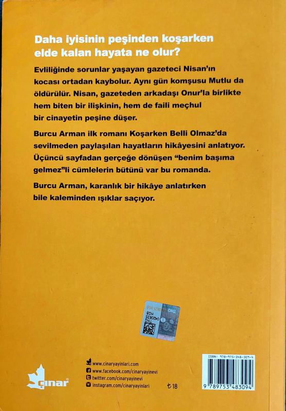 KOŞARKEN BELLİ OLMAZ, BURCU ARMAN tarafından kaleme alınmıştır. Kitap 2017 yılında ÇINAR YAYINLARI tarafından [İSTANBUL] yayınlanmıştır. Satışta olan kitap, yayınevinin 1. baskısıdır. 219 sayfadır. KOŞARKEN BELLİ OLMAZ adlı eser Türkçe dilindedir.