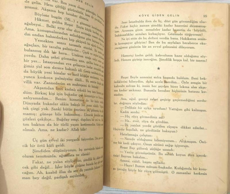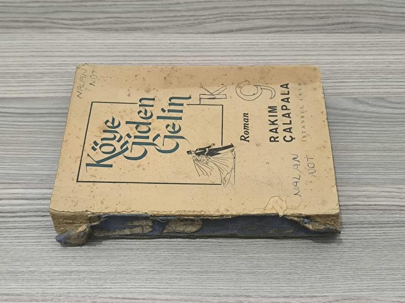Rakım Çalapala’nın Köye Giden Gelin adlı eseri, Güven Basımevi tarafından yayımlanmış birinci baskı erken dönem edisyonudur. Türk roman tarihinin gazeteci-yazar geleneğini temsil eden önemli isimlerinden Çalapala’nın bu eseri, dönemin sosyal atmosferini ve Anadolu temalı anlatı çizgisini yansıtan karakteristik bir metindir. Eserde yer alan “Birinci Bası” ibaresi, kitabı bibliyografik açıdan anlamlı kılmaktadır. Güven Basımevi etiketi ve dönem tipografisi, erken Cumhuriyet dönemi yayıncılığının sade ve işlevsel estetiğini taşır. Kitapta yoğun yaşanmışlık izleri, sırt kısmında ayrılma ve kapakta yıpranma mevcuttur. Buna rağmen metin bütünlüğü korunmuş, sayfalar eksiksizdir. Bu haliyle eser, restorasyonluk veya koleksiyon tamamlayıcı bir parça niteliğindedir. Türk edebiyatı koleksiyoncuları, erken dönem basımlar ve Güven Basımevi yayınlarını bir araya getiren raflar için dikkat çekici bir örnektir.