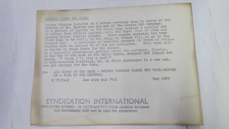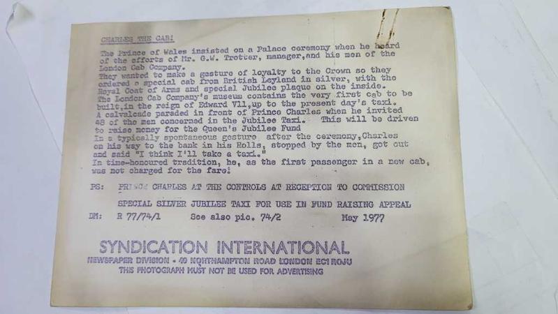 KRAL III. CHARLES'IN (CHARLES PHILIP ARTHUR GEORGE) ORİJİNAL 2'Lİ FOTOĞRAF SETİ - ORIGINAL (2) PHOTOGRAPH OF CHARLES III, (CHARLES PHILIP ARTHUR GEORGE) - 20 x 15 cm EBADINDA - GALLER PRENSİ CHARLES, LONDRA TAKSİ ŞİRKETİ YÖNETİCİSİ BAY G.W. TROTTER VE ADAMLARININ ÇABALARINI DUYDUĞUNDA SARAYDA BİR TÖREN DÜZENLENMESİNDE ISRAR ETTİ. KRALİYET AİLESİNE BAĞLILIKLARINI GÖSTERMEK İÇİN BRİTİSH LEYLAND'DAN ÖZEL BİR GÜMÜŞ TAKSİ SİPARİŞ ETTİLER; - (THE PRINCE CHARLES OF WALES INSISTED ON A PALACE CEREMONY WHEN HE HEARD OF THE EFFORTS OF MR. G.W. TROTTER, MANAGER, AND HIS MEN OF THE LONDON CAB COMPANY. THEY WANTED TO MAKE A GESTURE OF LOYALTY TO THE CROWN SO THEY ORDERED A SPECIAL CAB FROM BRITISH LEYLAND IN SILVER, WITH THE ROYAL COAT OF ARMS AND SPECIAL JUBILEE PLAQUE ON THE INSIDE. PRINCE CHARLES AT THE CONTROLS AT RECEPTION TO COMMISSION SPECIAL SILVER JUBILEE TAXI FOR USE IN FUND RAISING APPEAL. MAY 1977) - ÖZEL ARŞİV, en son bir ay önce güncellenmiştir.