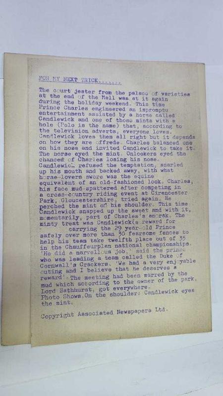 KRAL III. CHARLES'IN (CHARLES PHILIP ARTHUR GEORGE) ORİJİNAL 2'Lİ FOTOĞRAF SETİ - ORIGINAL (2) PHOTOGRAPH OF CHARLES III, (CHARLES PHILIP ARTHUR GEORGE) - 20 x 15 cm EBADINDA -MALL'UN SONUNDAKİ ÇEŞİTLİLİK SARAYININ SARAY SOYTARISI, TATİL HAFTASONU BOYUNCA YİNE İŞ BAŞINDAYDI. FOTOĞRAFTA GÖRÜLDÜĞÜ GİBİ: KRALİYET TARZINDA TAM İSABET: PRENS CHARLES, YÜZÜ YARIŞ PİSTİNDEN SIÇRAYAN ÇAMURLA KAPLI HALDE, ÇAMUR DENİZİNDE SAĞLAM ADIMLI ATI CANDLEWİCK'E ÖDÜLÜNÜ VERİYOR. - (THE COURT JESTER FROM THE PALACE OF VERIETIES AT THE END OF THE MALL WAS AT IT AGAIN DURING THE HOLIDAY WEEKEND. PHOTO SHOWS. ON THE NOSE ROYAL-STYLE: PRINCE CHARLES HIS FACE SPLATTERED BY DIRT FROM THE COURSE OFFERS HIS MOUNT, CANDLEWICK, A REWARD FOR SURE-FOOTEDNESS IN A SEA OF MUD.) - ÖZEL ARŞİV, en son bir ay önce güncellenmiştir.