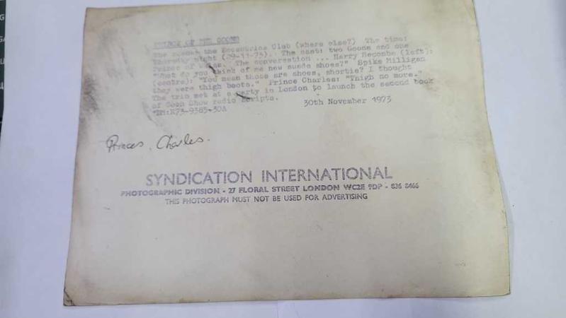 KRAL III. CHARLES'IN (CHARLES PHILIP ARTHUR GEORGE) ORİJİNAL FOTOĞRAFI - ORIGINAL PHOTOGRAPH OF CHARLES III, (CHARLES PHILIP ARTHUR GEORGE) - 20 x 15 cm EBADINDA - PRENS CHARLES, HARRY SECOMBE ve SPIKE MILIGAN SOHBET EDERLERKEN - (THE SCENE THE ECCENTRICS CLUB (WHERE ELSE?) THE TIME: THURSDAY NIGHT (29-11-1973). THE CAST TWO GOONS AND ONE PRINCE OF WALES. THE CONVERSATION... HARRY SECOMBE (LEFT): ''WHAT DO YOU THINK OF ME NEW SUEDE SHOES?'' SPIKE MILIGAN (CENTRE): ''YOU MEAN THOSE ARE SHOES, SHORTIE? I THOUGHT THEY WERE THIGH BOOTS.'' PRINCE CHARLES: ''THIGH NO MORE.'' THE TRIO MET AT A PARTY IN LONDON TO LUNCH THE SECOND BOOK OF GOON SHOW RADIO SCRIPTS. 30th NOVEMBER 1973) - ÖZEL ARŞİV başlıklı ürün, Efemera, Müzik, Sinema > Fotoğraflar > Diğer kategorisi altında İkinci El olarak satılmaktadır.