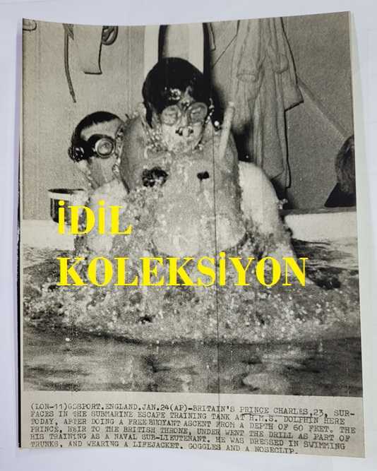 KRAL III. CHARLES'IN (CHARLES PHILIP ARTHUR GEORGE) ORİJİNAL HABER AJANSI BASIM FOTOĞRAFI - NEWS AGENCY PHOTO OF CHARLES III, (CHARLES PHILIP ARTHUR GEORGE) - 18 x 14 cm EBADINDA - PRENS CHARLES, İNGİLTERE'NİN GÜNEYİNDEKİ HAMPSHİRE, GOSPORT'TA BULUNAN HMS DOLPHİN DENİZALTI OKULUNDAKİ DENİZALTIDAN KAÇIŞ EĞİTİM TANKINDAN HIZLA FIRLIYOR. PRENS CHARLES, 18 METRELİK KAÇIŞ TANKINDAN ÇIKARKEN, EĞİTMENLER BAŞ ASTSUBAY MİCK SOUTHWOOD VE BAŞ ASTSUBAY DAVİD MALTBY TARAFINDAN İZLENİYOR. - (PRINCE CHARLES ROCKETS FROM THE SUBMARINE ESCAPE TRAINING TANK AT THE SUBMARINE SCHOOL HMS DOLPHIN, A SHORE TRAINING ESTEBLISHMENT AT GOSPORT, HAMPSHIRE, IN SOUTHERN ENGLAND. THE PRINCE CHRALES EMERGES FROM THE SIXTY-FOOT ESCAPE, WATCHED BY INSTRUCTORS CHIEF PETTY OFFICER MICK SOUTHWOOD AND CHIEF PETTY OFFICER DAVID MALTBY.) - ÖZEL ARŞİV, en son bir ay önce güncellenmiştir.