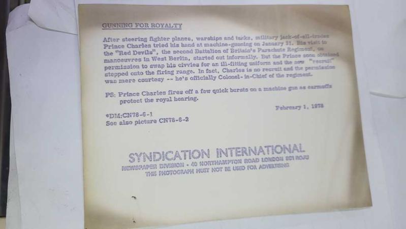 KRAL III. CHARLES'IN (CHARLES PHILIP ARTHUR GEORGE) ORİJİNAL HABER AJANSI BASIM FOTOĞRAFI - NEWS AGENCY PHOTO OF CHARLES III, (CHARLES PHILIP ARTHUR GEORGE) - 20 x 15 cm EBADINDA - SAVAŞ UÇAKLARI, SAVAŞ GEMİLERİ VE TANKLARI KULLANDIKTAN SONRA, HER İŞE EL ATAN ASKERİ UZMAN PRENS CHARLES, 31 OCAK'TA MAKİNELİ TÜFEK KULLANMAYI DENEDİ. BATI BERLİN'DEKİ TATBİKATLARDA BULUNAN İNGİLİZ PARAŞÜT ALAYI'NIN İKİNCİ TABURU "KIZIL ŞEYTANLAR"I ZİYARETİ GAYRİ RESMİ BİR ŞEKİLDE BAŞLADI. PRENS CHARLES, KULAKLIKLARLA KULAĞINI KORURKEN MAKİNELİ TÜFEKLE BİRKAÇ HIZLI ATIŞ YAPTI. - (AFTER STEERING FIGHTER PLANES, WARSHIPS AND TANKS, MILITARY JACK-OF-ALL-TRADES PRINCE CHARLES TRIED HIS HAND AT MACHINE-GUNNING ON JANUARY 31. HIS VISIT TO THE ''RED DEVILS'', SECOND BATTALION OF BRITAIN'S PARACHUTE REGIMENT, ON MANOEUVERS IN WEST BERLIN, STARTED OUT INFORMALLY. PRINCE CHARLES FIRES OFF A FEW QUICK BURSTS ON A MACHINE GUN AS EARMUFFS PROTECT THE ROYAL HEARING. FEBRUARY 1, 1978) - ÖZEL ARŞİV, en son bir ay önce güncellenmiştir.