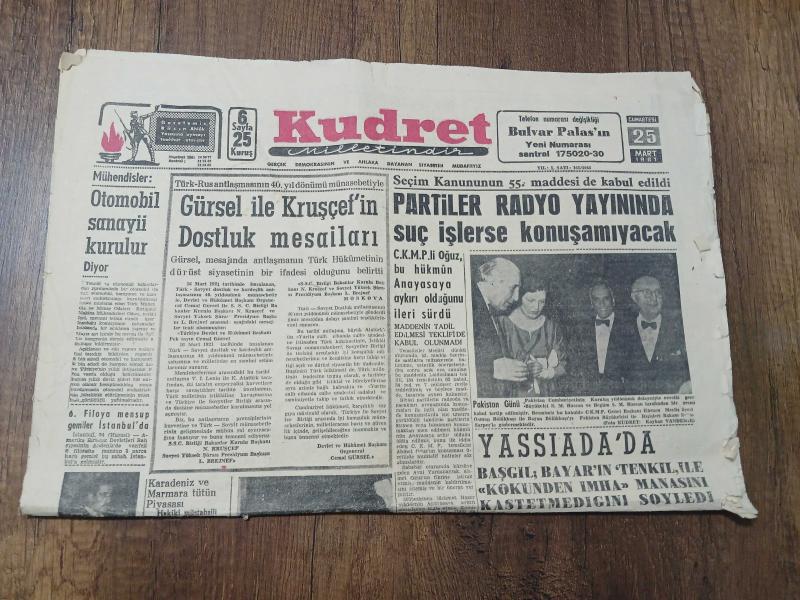 KUDRET GAZETESİ 25 MART 1961 - PARTİLER RADYO YAYININDA SUÇ İŞLERSE KONUŞAMIYACAK - GÜRSEL İLE KRUŞÇEF'İN DOSTLUK MESAJLARI, 8 ay önce satışa sunulmuştur.