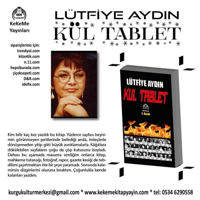 KÜL TABLET, LÜTFİYE AYDIN tarafından kaleme alınmıştır. Eser ALAATTİN TOPÇU editörlüğünde hazırlanmıştır. Kitap 2023 yılında KeKeMe Yayınları tarafından [Ankara] 978-625-7792-72-1 ISBN kodu ile yayınlanmıştır. Satışta olan kitap, yayınevinin 3. baskısıdır. 143 sayfadır. KÜL TABLET adlı eser Türkçe dilindedir.