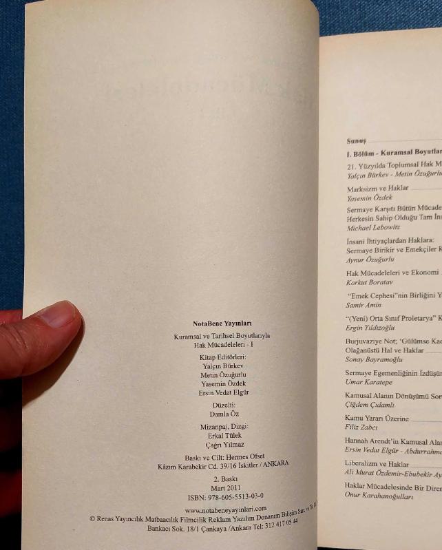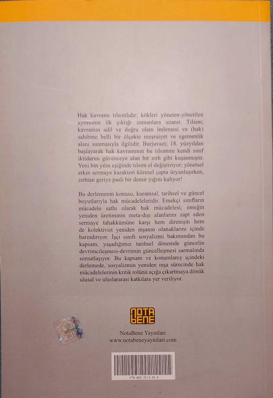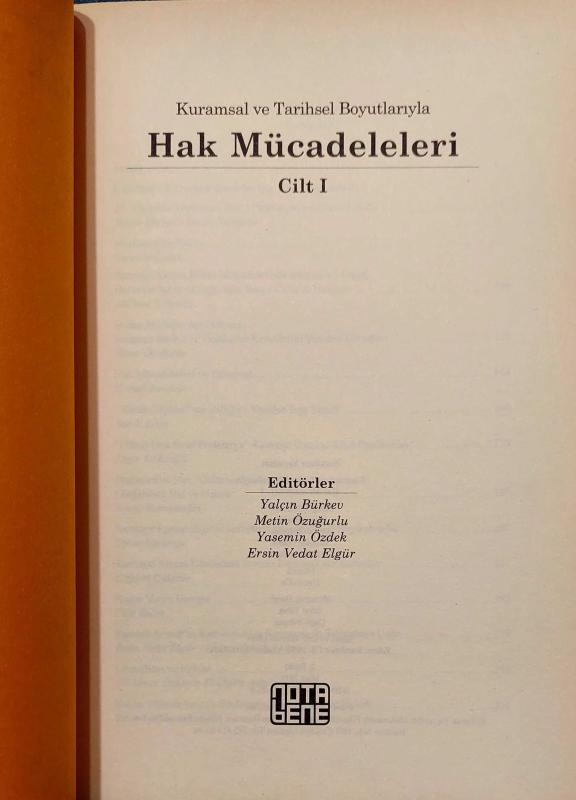 Kitap 2011 yılında NOTA BENE YAYINLARI tarafından [ANKARA] yayınlanmıştır. Satışta olan kitap, yayınevinin 2. baskısıdır. 326 sayfadır. KURAMSAL ve TARİHSEL BOYUTLARIYLA HAK MÜCADELELERİ 1 adlı eser Türkçe dilindedir.