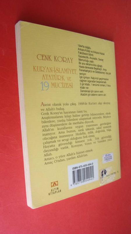 KUR'AN-İSLAMİYET ATATÜRK VE 19. MUCİZESİ., CENK KORAY tarafından kaleme alınmıştır. Kitap 1995 yılında ALTIN YAYIEVİ tarafından [isatanbul] yayınlanmıştır. 158 sayfadır. KUR'AN-İSLAMİYET ATATÜRK VE 19. MUCİZESİ. adlı eser Türkçe dilindedir.
