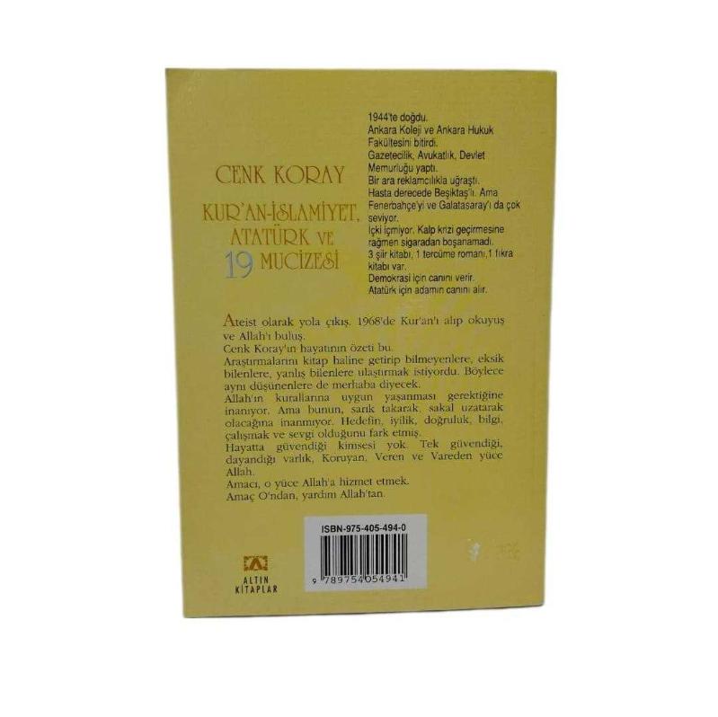 KUR'AN-İSLAMİYET, ATATÜRK VE 19 MUCİZESİ, CENK KORAY tarafından kaleme alınmıştır. Kitap 1996 yılında ALTIN KİTAPLAR tarafından [İstanbul] yayınlanmıştır. Satışta olan kitap, yayınevinin 16. baskısıdır. 158 sayfadır. Sayfa bilgisi 3.hamur olarak belirtilmiştir. KUR'AN-İSLAMİYET, ATATÜRK VE 19 MUCİZESİ adlı eser Türkçe dilindedir.