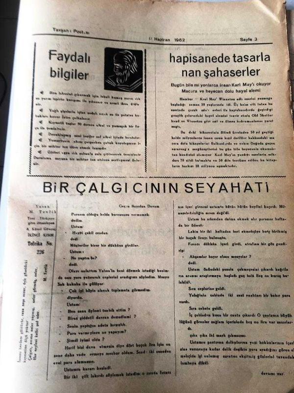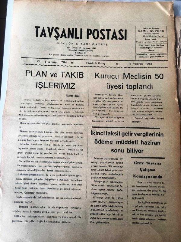 KÜTAHYA TAVŞANLI POSTASI GAZETESİ YEREL TAŞRA BASINI- 13 HAZİRAN 1962- YIL :13 SAYI :764- PLAN VE TAKİP İŞLERİMİZ HASENE ILGAZ- Kurucu Meclisin 50 Üyesi Toplandı - İkinci taksit gelir vergilerinin ödeme müddeti haziran sonu bitiyor - Grev Tasarısı Çalışma Komisyonunda - Tavşanlı Merkez Fevzipaşa İlkokuluna ve Öğrencilerini Koruma Derneği Nizamnamesi - Memleket Haberleri : Tek sabıkası olmayan bucak - Dazlaklar cemiyeti de kuruldu - Şoför yaralayan mahkum kaçtı - Bir çocuk iki taşıt arasında ezildi- - Faydalı Bilgiler - Hapishanede tasarlanan şaheserler -Bir Çalgıcının Seyahati - Yıpranma, sararmalar, kupon kesiği ve yırtılmalar zamana bağlı olarak görülebilir.