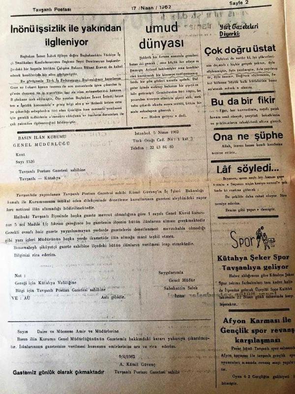 KÜTAHYA TAVŞANLI POSTASI GAZETESİ YEREL TAŞRA BASINI- 17 NİSAN 1962- YIL :13 SAYI :721- Bu Yol Uçuruma Gider -Maliye Bakanı Şefik İnan Bütün Vatandaşlar Vergi Verecek Dedi - Degirmisaz İşçisi sendikası kongresi olgun bir hava içinde geçti - Yalanlar Resmi Geçidi- İnönü işsizlik ile yakından ilgileniyor - Umut dünyası - Yurt Gazetecileri diyor ki : Çok doğru üstat -bu da bir fikir -Ona ne şüphe - Spor -Kütahya Şeker Spor Tavşanlıya Geliyor - Afyon Karması İle Gençlik Spor Revanş Karşılanması - Yıpranma, sararmalar, kupon kesiği ve yırtılmalar zamana bağlı olarak görülebilir.