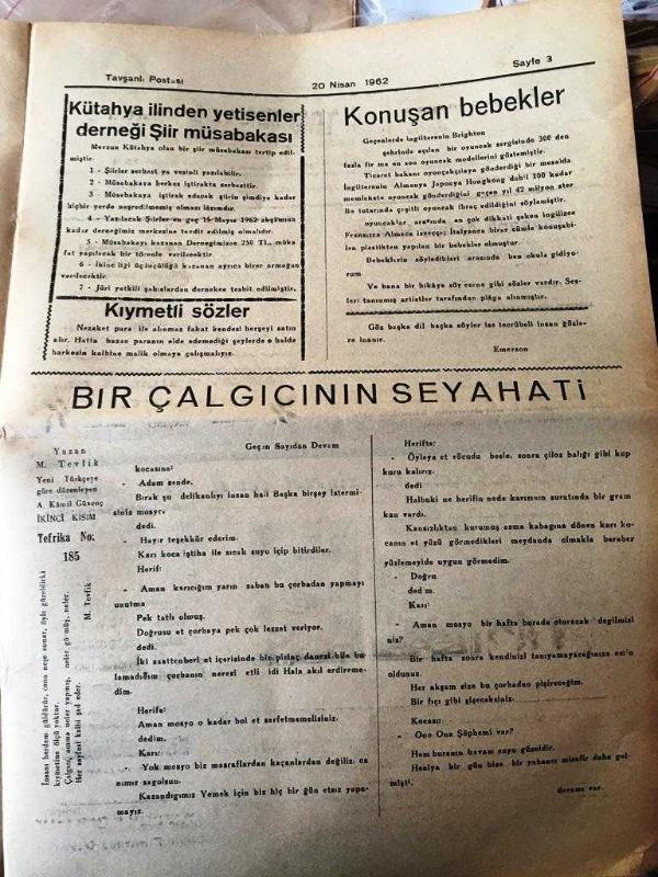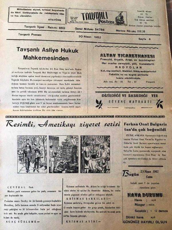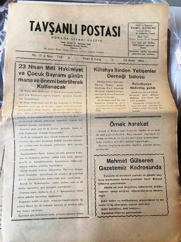 KÜTAHYA TAVŞANLI POSTASI GAZETESİ YEREL TAŞRA BASINI- 20 NİSAN 1962-YIL :13 SAYI :724- 23 Nisan Milli Hakimiyet Ve Çocuk Bayramı Günün Mana Ve Önemi Belirtilerek Kutlanacak - Kütahya İlinden Yetişenler Derneği Balosu - Belediye Müfettişi Geldi Mülkiye Müfettişi Arif Tümer İlçemize Gelmiştir - Mehmet Gülseren Gazetemizin Kadrosunda - Sucuk İmalathanesi Yapılıyor - Yurt Gazetecileri Diyor ki : Bakış - İkinci Grup - Kütahya İlinden Yetişenleri Derneği Şiir Müsabakası - Bir Çalgıcının Seyahati -Konuşan Bebekler - Tavşanlı Asliye Hukuk Mahkemesinden - Yıpranma, sararmalar, kupon kesiği ve yırtılmalar zamana bağlı olarak görülebilir.