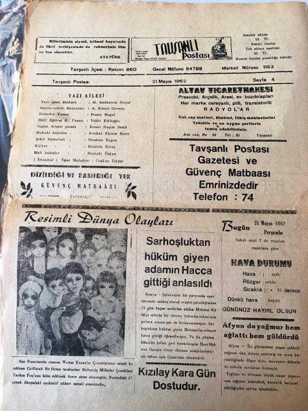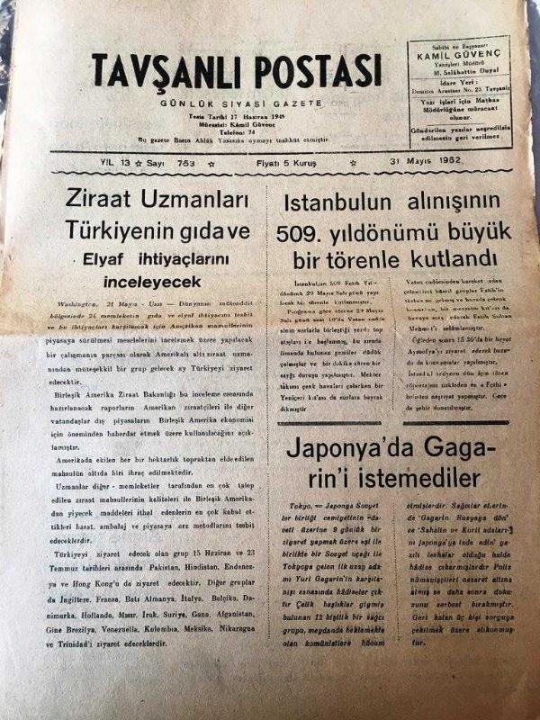 KÜTAHYA TAVŞANLI POSTASI GAZETESİ YEREL TAŞRA BASINI- 31 Mayıs 1962-YIL :13 SAYI :753- Ziraat Uzmanları Türkiye 'nin Gıda Ve Elyaf İhtiyaçlarını İnceleyecek -İstanbul 'un alınışının 509. yıldönümü büyük bir törenle kutlandı - Japonya da Gagarin 'i İstemediler - 2 dakika da 15 metre boyunda sosis imal eden makine - 1961 senesi turizm mevsimi iyi başladı - Memleket Haberleri : Mersin Rafinesi ilk ham petrollü İstanbul a Sevk etti - Lefkoşe Fuarına 15 Firma İştirak Ediyor - Siirt 'te soygunculuk olayları devam ediyor - Kütahya ilinden yetişenler derneği şiir müsabakası - 26 Bergama kermesi törenle açıldı - Bir çalgıcının seyahati Yıpranma, sararmalar, kupon kesiği ve yırtılmalar zamana bağlı olarak görülebilir.