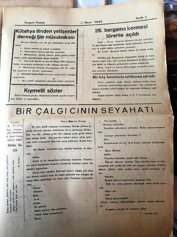 KÜTAHYA TAVŞANLI POSTASI GAZETESİ YEREL TAŞRA BASINI- 31 Mayıs 1962-YIL :13 SAYI :753- Ziraat Uzmanları Türkiye 'nin Gıda Ve Elyaf İhtiyaçlarını İnceleyecek -İstanbul 'un alınışının 509. yıldönümü büyük bir törenle kutlandı - Japonya da Gagarin 'i İstemediler - 2 dakika da 15 metre boyunda sosis imal eden makine - 1961 senesi turizm mevsimi iyi başladı - Memleket Haberleri : Mersin Rafinesi ilk ham petrollü İstanbul a Sevk etti - Lefkoşe Fuarına 15 Firma İştirak Ediyor - Siirt 'te soygunculuk olayları devam ediyor - Kütahya ilinden yetişenler derneği şiir müsabakası - 26 Bergama kermesi törenle açıldı - Bir çalgıcının seyahati, Kamil Güvenç tarafından kaleme alınmıştır. Kitap 1949 yılında [Güvenç MATBAASI ] yayınlanmıştır. 4 sayfadır. KÜTAHYA TAVŞANLI POSTASI GAZETESİ YEREL TAŞRA BASINI- 31 Mayıs 1962-YIL :13 SAYI :753- Ziraat Uzmanları Türkiye 'nin Gıda Ve Elyaf İhtiyaçlarını İnceleyecek -İstanbul 'un alınışının 509. yıldönümü büyük bir törenle kutlandı - Japonya da Gagarin 'i İstemediler - 2 dakika da 15 metre boyunda sosis imal eden makine - 1961 senesi turizm mevsimi iyi başladı - Memleket Haberleri : Mersin Rafinesi ilk ham petrollü İstanbul a Sevk etti - Lefkoşe Fuarına 15 Firma İştirak Ediyor - Siirt 'te soygunculuk olayları devam ediyor - Kütahya ilinden yetişenler derneği şiir müsabakası - 26 Bergama kermesi törenle açıldı - Bir çalgıcının seyahati adlı eser Türkçe dilindedir.