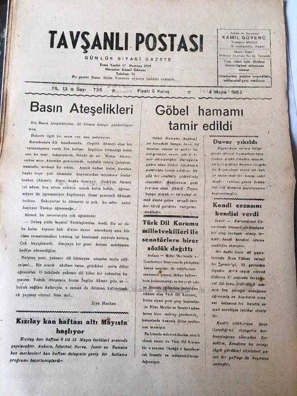 KÜTAHYA TAVŞANLI POSTASI GAZETESİ YEREL TAŞRA BASINI- 4 Mayıs 1962 -YIL :13 SAYI :735- Basın Ateşelikleri - Kızılay kan haftası altı mayısta başlıyor - Göbel hamamı tamir edildi - Türk Dil Kurumu Milletvekilleri ile Senatörlere Birer Sözlük Dağıttı - Kendi cezasını kendi verdi - Cannes Film Festivali 7 Mayıs ta Başlıyor - Memleket Haberleri - Diyarbakır da Çekirge Mücadelesi - Tren altında kaldı - -Zara da bölge okulu kurulması teklif ediliyor - Kütahya ilinden yetişenleri derneği şiir müsabakası - -Çok Konuşuyoruz -, Kamil Güvenç tarafından kaleme alınmıştır. Kitap 1949 yılında [GÜVENÇ MATBAASI ] yayınlanmıştır. 4 sayfadır. KÜTAHYA TAVŞANLI POSTASI GAZETESİ YEREL TAŞRA BASINI- 4 Mayıs 1962 -YIL :13 SAYI :735- Basın Ateşelikleri - Kızılay kan haftası altı mayısta başlıyor - Göbel hamamı tamir edildi - Türk Dil Kurumu Milletvekilleri ile Senatörlere Birer Sözlük Dağıttı - Kendi cezasını kendi verdi - Cannes Film Festivali 7 Mayıs ta Başlıyor - Memleket Haberleri - Diyarbakır da Çekirge Mücadelesi - Tren altında kaldı - -Zara da bölge okulu kurulması teklif ediliyor - Kütahya ilinden yetişenleri derneği şiir müsabakası - -Çok Konuşuyoruz - adlı eser Türkçe dilindedir.