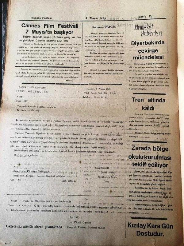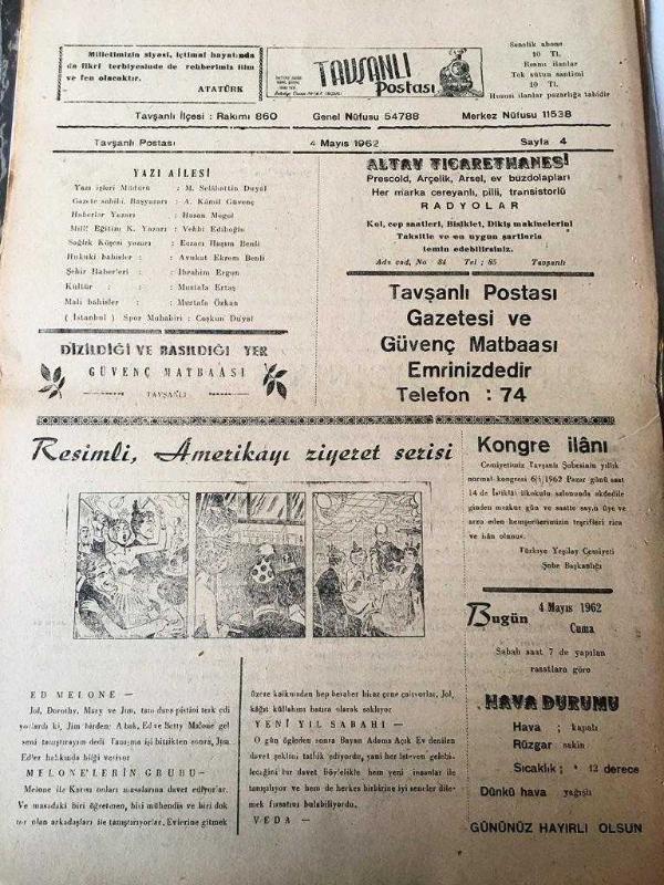 KÜTAHYA TAVŞANLI POSTASI GAZETESİ YEREL TAŞRA BASINI- 4 Mayıs 1962 -YIL :13 SAYI :735- Basın Ateşelikleri - Kızılay kan haftası altı mayısta başlıyor - Göbel hamamı tamir edildi - Türk Dil Kurumu Milletvekilleri ile Senatörlere Birer Sözlük Dağıttı - Kendi cezasını kendi verdi - Cannes Film Festivali 7 Mayıs ta Başlıyor - Memleket Haberleri - Diyarbakır da Çekirge Mücadelesi - Tren altında kaldı - -Zara da bölge okulu kurulması teklif ediliyor - Kütahya ilinden yetişenleri derneği şiir müsabakası - -Çok Konuşuyoruz - Yıpranma, sararmalar, kupon kesiği ve yırtılmalar zamana bağlı olarak görülebilir.