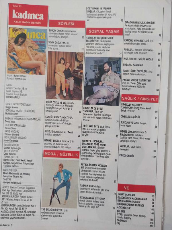 Kadınca Dergisi- Temmuz 1986- Burçin Orhon- Münir Özkul- Sevim Çağlayan- Mehmet Eroğlu- Yaz Şıklığı Sürüyor- Erkekler de Ev İşi Yapabilir- Yaşasın Aşk!- Biz Boşanmak İstiyoruz Yıpranma, sararmalar, kupon kesiği ve yırtılmalar zamana bağlı olarak görülebilir
