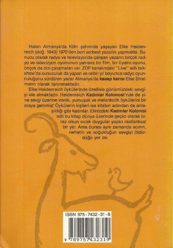 Kadınlar Kolonisi, Elke Heidenreich tarafından kaleme alınmıştır. Kitap 1993 yılında Papirüs Yayınevi tarafından [İstanbul] 9789757432319 ISBN kodu ile yayınlanmıştır. Satışta olan kitap, yayınevinin 1. baskısıdır. 150 sayfadır. Kadınlar Kolonisi adlı eser Türkçe dilindedir.