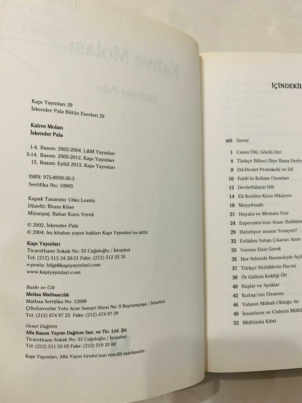 Kahve Molası, İskender Pala tarafından kaleme alınmıştır. Kitap 2013 yılında Kapı Yayınları tarafından yayınlanmıştır. 316 sayfadır. Kahve Molası adlı eser Türkçe dilindedir.