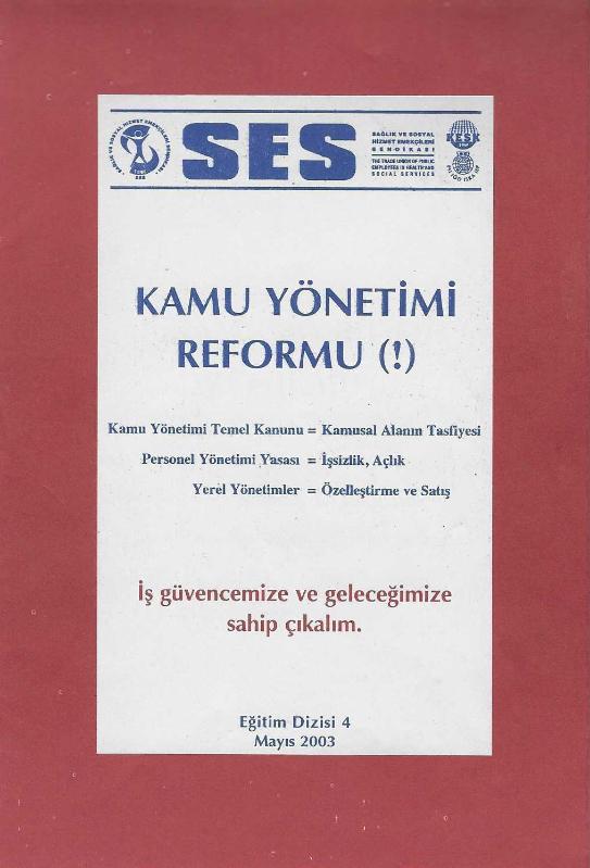 Kamu yönetimi reformu, SES Sağlık Emekçileri Sendikası tarafından kaleme alınmıştır. Kitap 2003 yılında [Ankara] yayınlanmıştır. 16 sayfadır. Kamu yönetimi reformu adlı eser Türkçe dilindedir.