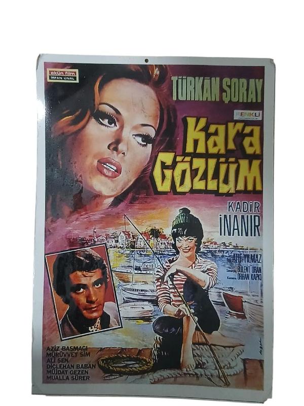 Kara Gözlüm Türkan Şoray Poster ... Yaşına göre oldukça temiz durumdadır.Çift taraflı baskıdır.Her iki tarafında da aynı resim vardır.Köpük,mukavva tarzı bir materyale baskı yapılmıştır.Resimde göründüğü gibi köşelerinde ve bazı yerlerinde deformasyonlar vardır. Boyutu 35x50 cm'dir.