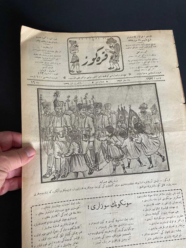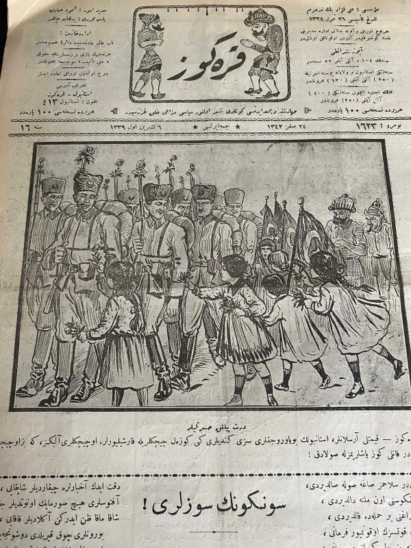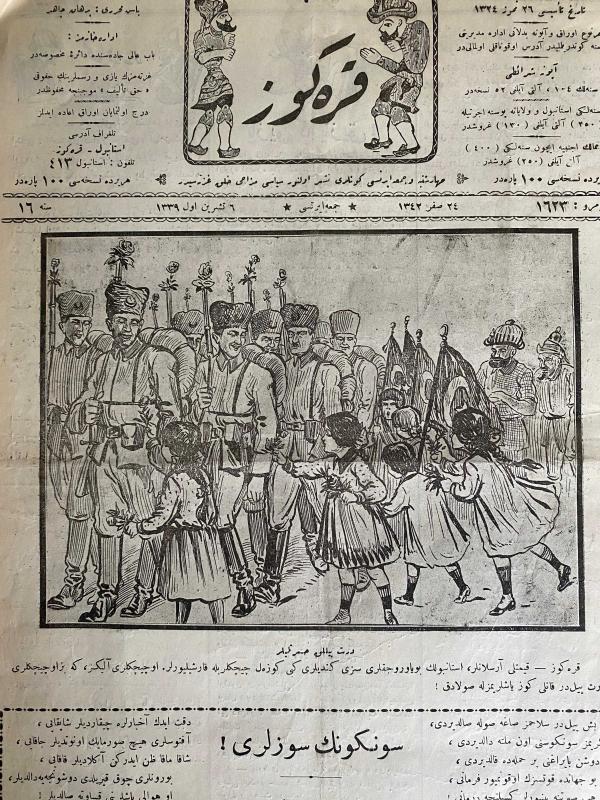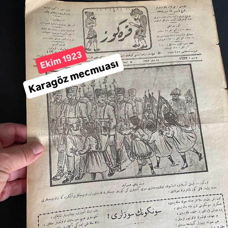 NADİR - koleksiyonluk Osmanlıca KARAGÖZ mecmuası. Ekim 1923 tarihli. Cumhuriyetin ilanı döneminde çıkan gazete. . *KARAGÖZ, 6 Ekim 1923, sayı 1623, 4 sayfa, Osmanlı Türkçesi Kapakta, 6 Ekim 1923 tarihinde İstanbul'a giren Türk ordusunu ellerinde Türk bayrağı ve çiçeklerle karşılayan çocuklar resmedilmiş.