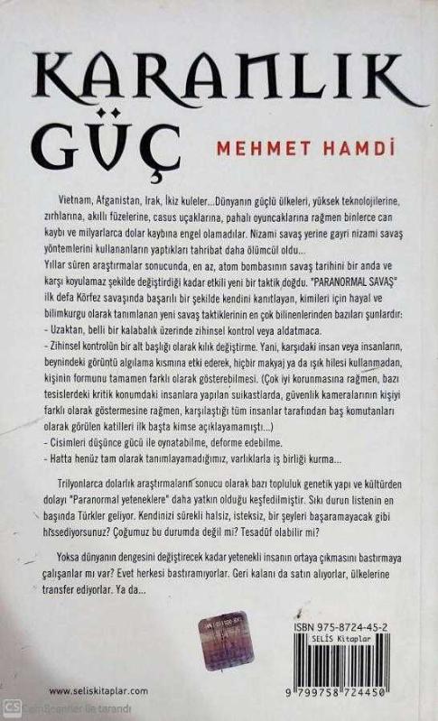 Karanlık Güç/Paranormal Savaşlar, MEHMET HAMDİ tarafından kaleme alınmıştır. Kitap 2006 yılında Selis Kitaplar tarafından yayınlanmıştır. 206 sayfadır. Karanlık Güç/Paranormal Savaşlar adlı eser Türkçe dilindedir.