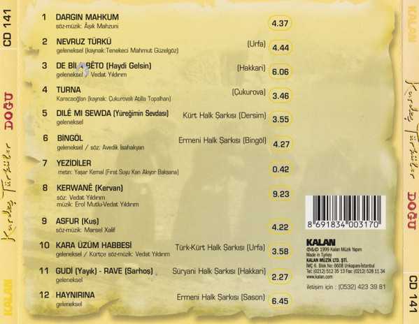 Tracklist 1 Dargın Mahkum 4:37 2 Nevruz Türkü 4:44 3 De Bila Bêto (Haydi Gelsin) 6:06 4 Turna 3:46 5 Dılé Mı Sewda (Yüreğimin Sevdası) 3:55 6 Bingöl 4:27 7 Yezidiler 0:42 8 Kerwanê 9:23 9 Asfur (Kuş) 4:22 10 Kara Üzüm Habbesi 3:58 11 Gudi (Yayık) - Rave (Sarhoş) 2:27 12 Haynırına 6:45 2.EL ORİJİNAL TEK KUSURU AMBALAJININ AÇIK OLMASI Resimler Ürünün Kendisine aittir. Görsellerde bulunan Ürün tarafınıza gönderilecektir. HER TÜRLÜ SORULARINIZ İÇİN MESAJLARINIZI BEKLİYORUZ. Mağazamızda satışa sunduğumuz tüm ürünlerimiz stoklarımızdadır. Mağazamızda bulunan 2. El ürünler özel ve sorunsuzdur! 2.EL Ürünlerimiz temiz ve çalışır durumdadır. 2 veya daha fazla ürün alırsanız, tek bir pakette kargolarız ve ayrı kargo ücreti ödemezsiniz. Aksi belirtilmediği sürece 24 saat içinde siparişlerinizin gönderimini sağlarız. Mağazamızda gördüğünüz ürünler sadece bir kısmını temsil eder, özel talepleriniz için bize ulaşabilirsiniz. Plak, CD, Kaset, DVD koleksiyonlarınızı değerlendirmek istiyorsanız fiyat teklifi alın. İlgili her konuda bize ulaşmaktan çekinmeyin. ÜRÜNLERİMİZE GÖSTERDİĞİNİZ İLGİDEN DOLAYI TEŞEKKÜR EDERİZ!