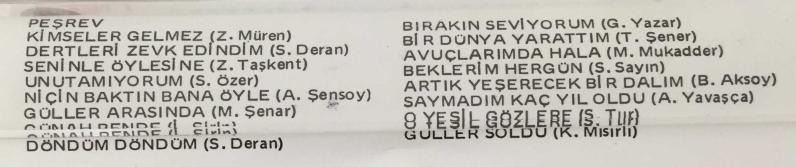 Karışık Şarkılar - (Kaset) Taner Şener, Mualla Mukaddes, Suat Sayın, Behiye Aksoy, Zeki Müren, Sevim Deran, Ziya Taşkent, Şükran Özer, Alaaddin Yavaş, en son 1 yıl önce güncellenmiştir.