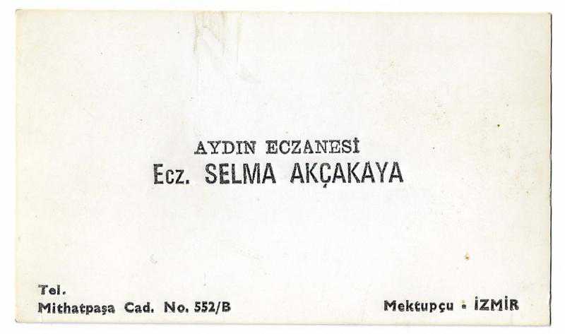 Kartvizit: Aydın Eczanesi / Ecz. Selma Akçakaya - İzmir, 7 yıl önce satışa sunulmuştur.