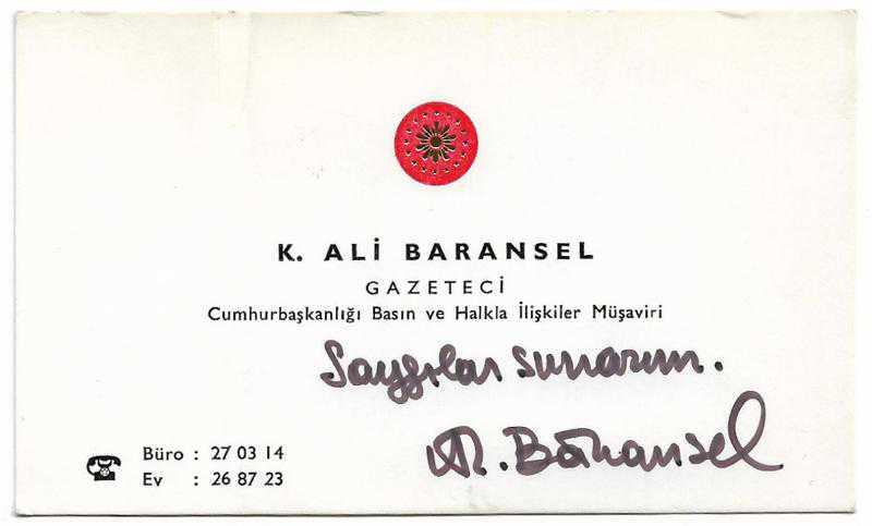 K. Ali Baransel, Gazeteci, Cumhurbaşkanlığı Basın ve Halkla İlişkiler Müşaviri, imzalı.