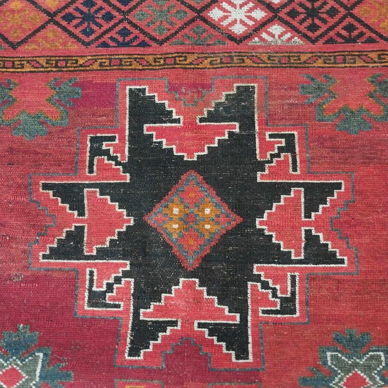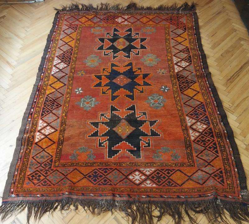 Kazak Halısı – 19. Yüzyıl Öncesi, El Dokuması, Yün ve Kök Boya, Koleksiyonluk Kazak, Kafkasya, 1800 öncesi. El dokuması, %100 yün iplik ve doğal kök boyalarla üretilmiş, 200 yılı aşkın geçmişe sahip orijinal Kazak halısı. Orta bölümde üç büyük sekiz kollu yıldız motifi, etrafında stilize çiçek ve geometrik baklava desenleriyle zenginleştirilmiştir. Kırmızı, siyah, turuncu ve mavi renklerin hâkim olduğu kompozisyon, Kazak halılarının karakteristik estetiğini yansıtmaktadır. 📏 Ölçüler: 145 x 200 cm ⚜️ Kondisyon: Çok İyi (koleksiyonluk seviyede korunmuş)