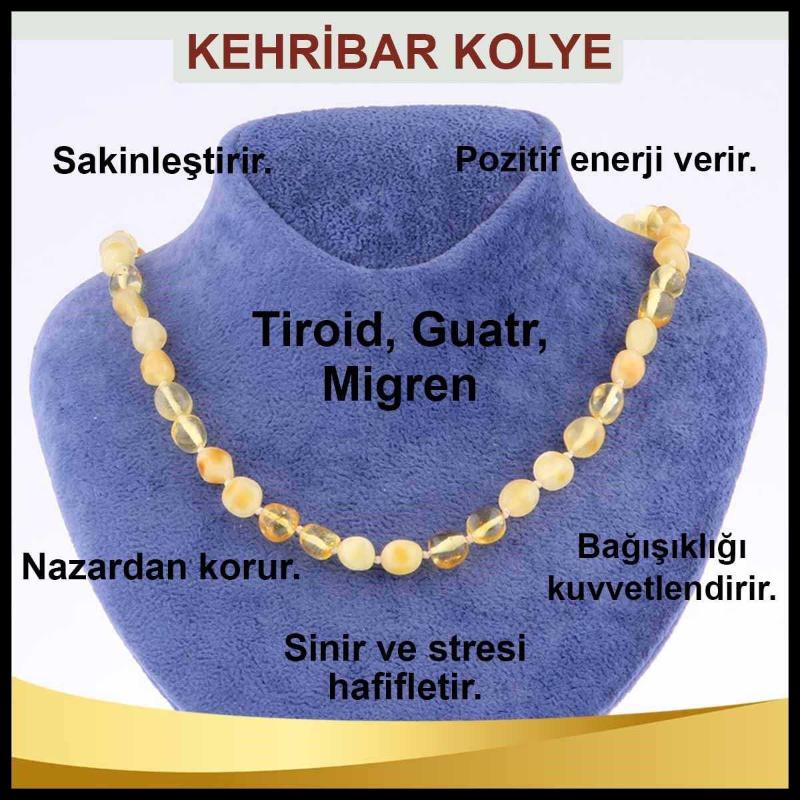 Kehribar (Fosilleşmiş Çam Reçinesi) Kolye 8 mm - M364 Kehribar taşının faydaları: Gerdanlık olarak kullanılırsa boğaz ve Tiroid bezi iltihaplarını yok eder, guatrın oluşmasın önler, oluşmuşsa önce büyümesini durdurur ve sonra küçülterek ortadan kaldırır. Kulak ağrılarını iyileştirir. Böbrek, mesane ve dalağı temizler, sağlıklı çalışmasını sağlar. Astım, bronşit gibi solunum yolları hastalıklarını önler, oluşmuşsa iyileştirir. Alerjileri önler ve iyileştirir. Enfeksiyonun yayılmasını durdurur. Tüm ağrı sorunlarında iyileştiricidir. Ağrı (sancı) bulunan beden bölümlerine sürüldüğünde ağrıyı azaltır. Özellikle romatizmal ağrılarda etkilidir. Kısa tarihçesi: Antik Romada çeşitli hastalıklara karşı (akıl hastalıkları) koruyucu olarak kullanılmıştır. Kehribar tozu ile bal karışımının boğaz, kulak ve göz rahatsızlıkları için, suyla içilen kehribar tozunun ise mide hastalıklarına iyi geldiği düşünülmekteydi. Fars bilim adamı İbni Sina, kehribarı birçok hastalığa ilaç olarak niteliyordu. Doğu ülkelerindeki inanışa göre, kehribar dumanı ruhu güçlendiriyor ve cesaret veriyordu. Çin'de, succinic asit ve haşhaşdan yapılan şurup sakinleştirici ve ağrı kesici olarak kullanılıyordu. Orta Çağ'da, sarılığın iyileştirilmesi için kehribar taneleri taşınırdı. Vücut zayıflığına ve cildin sağlıksız rengine bu sarı taşın sihirli güçlerinin engel olacağına inanılıyordu. Doğumu çabuklaştırdığı, yılan ısırmalarına, diş ağrısına, romatizmaya çare olduğu düşünülüyordu. Oleum Succini (Kehribar yağı), balsamum succini (Kehribar balzamı), extractum succini (Kehribar ekstresi) o dönemlerde reçetelerde sık sık kullanılmıştır. Prusyalılarda böbrek taşı rahatsızlıkları için kehribar reçetelerini kullanmışlardır. Litvanya'da ölen kişinin ardından kehribar tütsü yakılarak, şeytani ruhların bedenden uzaklaşmasına ve iyi ruhların çağrılmasına çalışılırdı. Yeni doğan bebeklerin ise tütsülenerek hızlı büyüyüp yetişmesine, yeni evlilerin ise mutlu yaşayıp, savaşa giden erkeklerin zaferle dönmelerinin sağlanmasına çalışılırdı. I. Dünya Savaşı'na kadar kehribar hala bazı hastalıkların tedavisinde kullanılmaktaydı. Kaynaklar: Hasan KOCABAŞ, Wikipedia.
