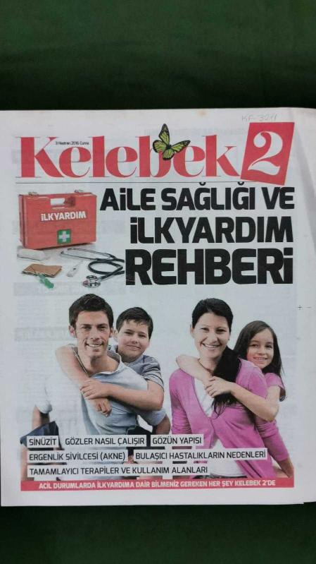 Kitap 2016 yılında yayınlanmıştır. 8 sayfadır. Kelebek 2 Gazete 3 Haziran 2016 Aile Sağlığı ve İlkyardım Rehberi,Gözler Nasıl Çalışır ?,Sinüzit,Horlama,Uyku Apnesi,Tıkayıcı Uyku Apnesi,Gözün Yapısı,Ergenlik Sivilcesi,Bulaşıcı Hastalıkların Nedenleri,Tamamlayıcı Terapiler Ve Kullanımları,Herbalism,Refleksoloji,Şiyatsu adlı eser Türkçe dilindedir.