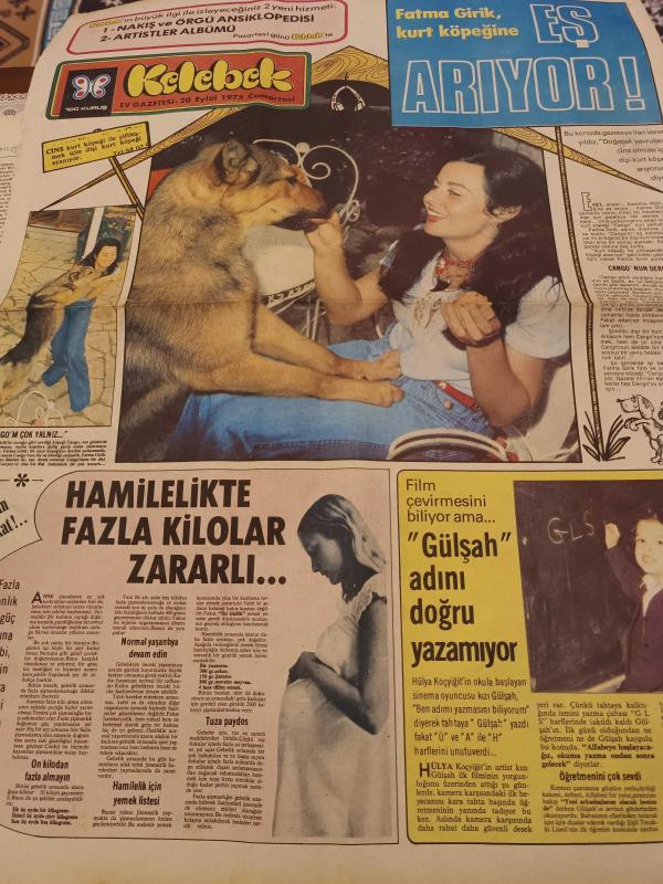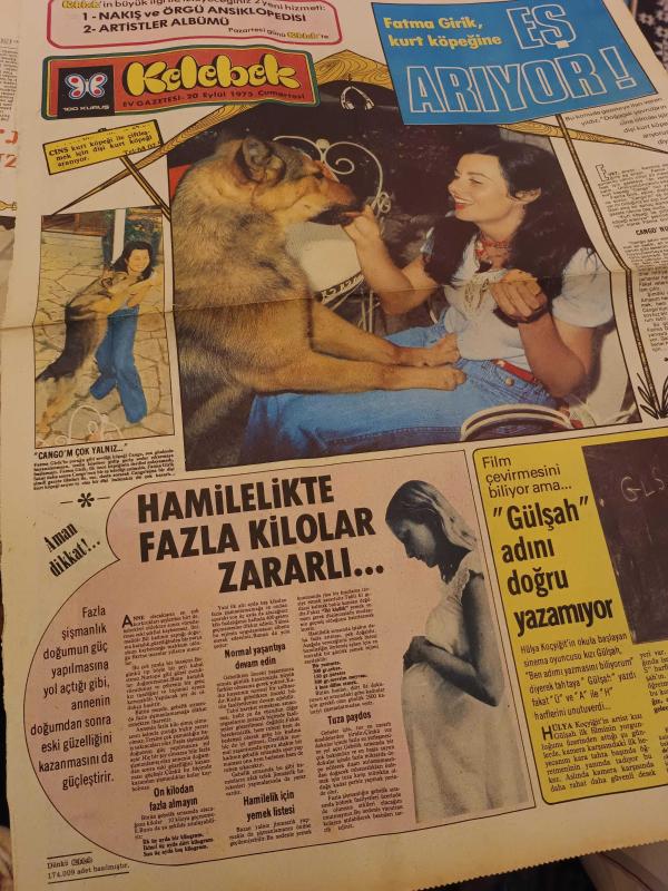 Kelebek Ev Gazetesi manşet sayfası - 20 Eylül 1979- Fatma Girik eş arıyor. Gülşen Bubikoğlu, Tarık Akan, Hülya Koçyiğit, Muazzez Abacı, Cüneyt Arkın, Zeki Müren,, Ajda Pekkan , Filiz Akın. adlı eser Türkçe dilindedir.