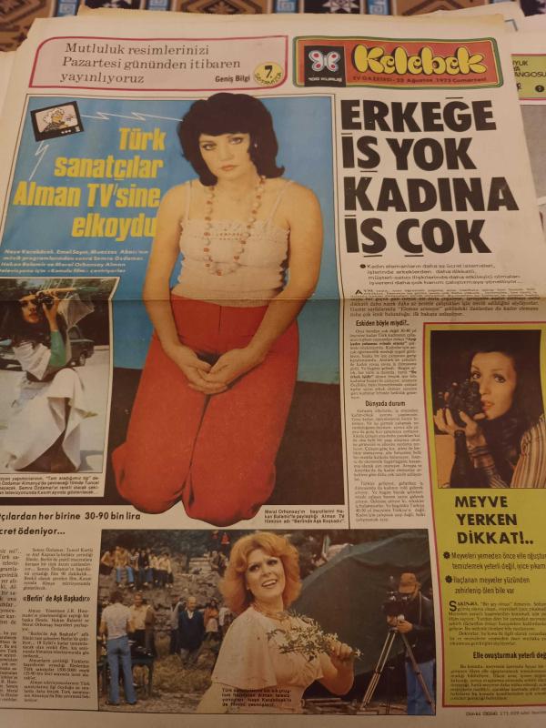 Kelebek Ev Gazetesi manşet sayfası - 23 Ağustos 1975- Türk sanatçılar Alman TV sine el koydu. Erkeğe iş yok Kadına iş çok.Meral Orhonsay, Neşe Karaböcek,Semra Özdamar adlı eser Türkçe dilindedir.