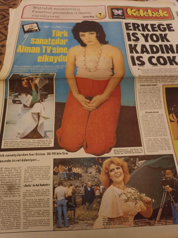 Kelebek Ev Gazetesi manşet sayfası - 23 Ağustos 1975- Türk sanatçılar Alman TV sine el koydu. Erkeğe iş yok Kadına iş çok.Meral Orhonsay, Neşe Karaböcek,Semra Özdamar adlı eser, Kitap > Süreli Yayınlar > Gazeteler kategorisinde İkinci El olarak satıştadır.