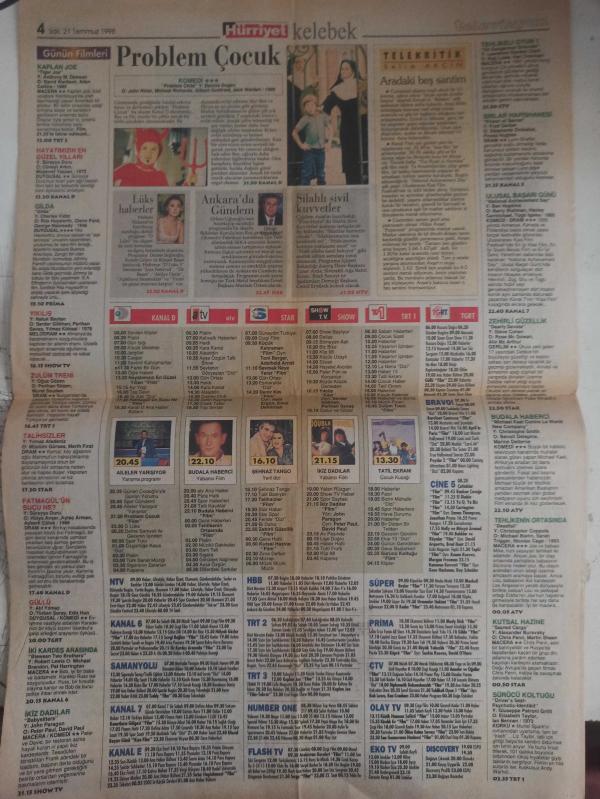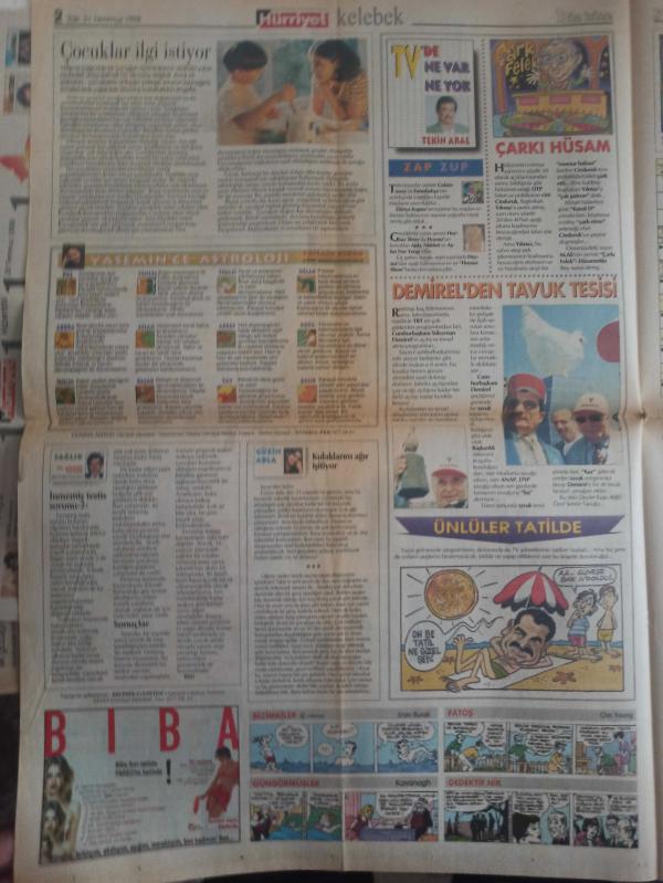 Kelebek Magazin Gazetesi - 21 Temmuz 1998 - Sağlıklı Beslenmeyle Stresi Yenin - Sırttaki Sır - Barış Manço - Süleyman Demirel - 40 Yıllık Emeğin Ödülü - Zarif Dekolte - Derin Kesin - Dantel Şıklığı - Kemal Günay - Çocuklar İlgi İstiyor - Tekin Aral - Çarkı Hüsam - Demirel'den Tavuk Tesisi - Ünlüler Tatilde - Gündüz Tezmen - Güngörmüşler (Kavanagh) - Fatoş (Chic Young) - Dedektif Nik - Bizimkiler (Ersin Burak) Çizgi Romanları - Tüzmen - Şirin Alışverişte - NewYrok muhabirimiz İstanbul'da Evlendi - 40 Yıllık Emeğin Ödülü - Problem Çocuk - Selim Akçin - Silahlı Sivil Kuvveler - Ankara'da Gündem - Lüks Haberler fotoğraf ve haberi - Tam Takım Gazete Yıpranma, sararmalar, kupon kesiği ve yırtılmalar zamana bağlı olarak görülebilir