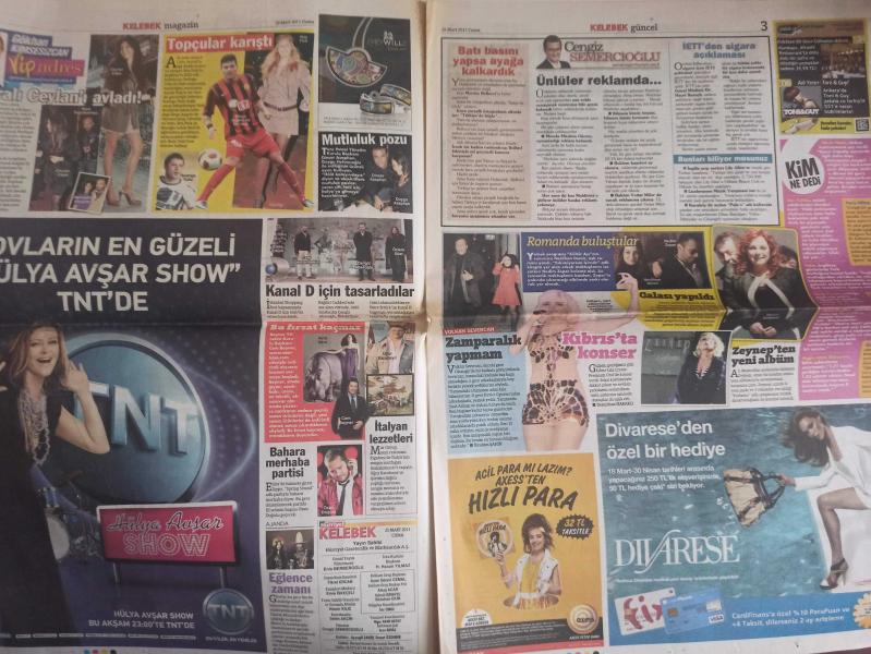 Kelebek Magazin Gazetesi - 25 Mart 2011 - Serdar Şenel - Siren Ertan - Fahriye Evcan - Özcan Deniz - Karolina Kurkova - Monica Bellucci - Rıza Kocaoğlu - Nejat İşler - Ahu Türkpençe - Yiğit Özşener - Emrah Yücel - Simla Yücel - Yiğit Özşener - Ceylan Çapa - Berk Suyabatmaz - Levent Üzümcü - Ozan Doğulu - Cem Boyner - Azra Akın - Uğur Karabayır - Özlem Süer - Cengiz Abazoğlu - Cem Lokmanhekim - Emre Ertürk - Duygu Azaphan - Dinçer Azaphan - Ceylan Çapa - Cengiz Semercioğlu - Derya Alabora - Nedim Zeper - Neslihan Demir - Volkan Severcan - Melis Alphan - Siren Ertan - Tuna Kiremitçi - Melike Karakartal - Osman Müftüoğlu - Serdar Şenel - Yonca Tokbaş - Nilgün Kasapbaşoğlu - Zeliha Sunal - Zeyno Gönenç - Nilgün Belgün - Güzin Abla - George Clooney - Onur Baştürk - Abbie Cornish fotoğraf ve haberi - Tam Takım Gazete Yıpranma, sararmalar, kupon kesiği ve yırtılmalar zamana bağlı olarak görülebilir
