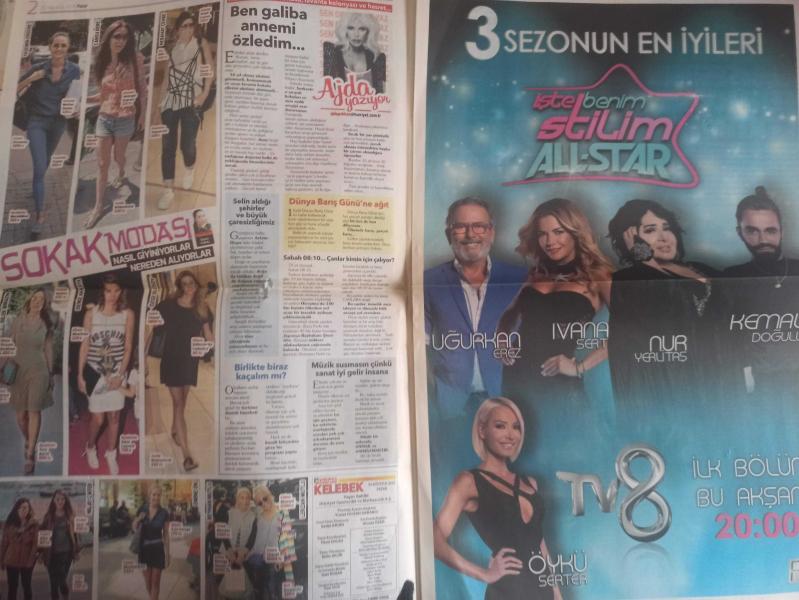 Kelebek Magazin Gazetesi - 30 Ağustos 2015 - Ajda Pekkan - Cüneyt Arkın - Burhan Öçal - Ömür Gedik - İzzet Çapa - Serenay Sarıkaya - Seyfi Dursunoğlu - Hande Erçel - Tolga Sarıtaş - Emre Kınay - Evrim Alasya - Miray Akay - Berk Atan - Burcu Özbek - Nebahat Çehre - Cansu Dere - Yasemin Ergene - Özge Ulusoy - Deniz Akkaya - Dilek Birgen - Lerzan Mutlu - Reyhan Mutlu - Emine Ün - Nilay Cafer - Ömür Gedik - Demet Özdemir Yıldırım - Onur Baştürk - Spora Göre Şekillenen Hayatlar - Pantene Altın Kelebek - Bensu Soral - Hande Erçel - Nilay Deniz fotoğraf ve haberi - Tam Takım Dergi Yıpranma, sararmalar, kupon kesiği ve yırtılmalar zamana bağlı olarak görülebilir