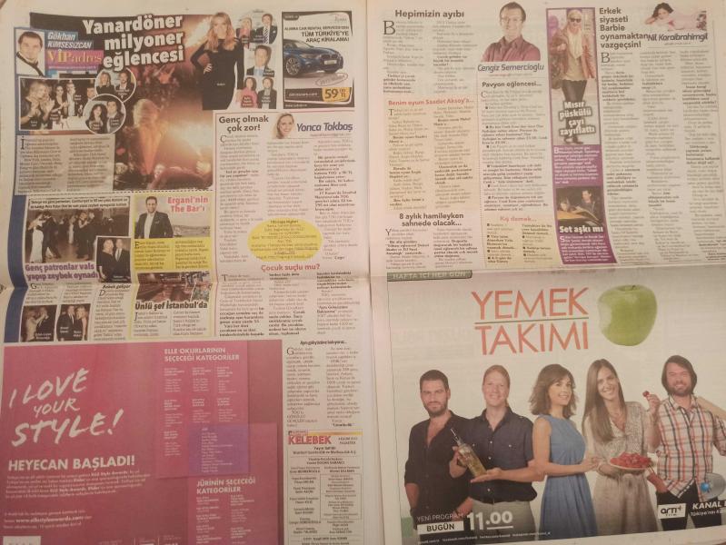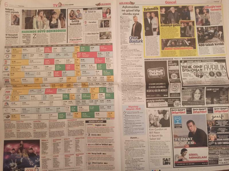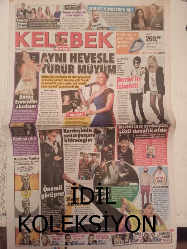 Kelebek Magazin Gazetesi - 4 Kasım 2013 - Türkan Şoray - Cengiz Aytmatov - Derin Mermerci - Nihat Doğan - Sedat Kapanoğlu - Ebru Gündeş - Sezen Aksu - Fatih Terim - Roberto Mancini - Ebru ŞAllı - Sinan Akçıl - Hasan Kaçan - Tuğçe kazaz - Cem Kılıç - Demet Akalın - Okan Kurt - Süleyman Dilek - Berkay - Yonca Tokbaş - Saruhan Tan - Ahmet Toprak - Burcu Akdarı - Hadise - Sevim Emre - Orhan Gencebay - Önder Bekensir - Cengiz Karavan - Ayfer Toprak Karavan - Cengiz Semercioğlu - Nil Karaibrahimoğlu - Banu Zorlu - Selen Seyven - Nuri Soysal - Güzin Abla - İzzet Çapa - Drag Queen - Ersan Erdura - Semiha Yankı - Tarık Akan - Rutkay Aziz - Emre Karayel - Arda Esen - Ece Gürsel - Dilara Endican - Hakan Öztürk - Tanem Sivar - Onur Baştürk - Ekim Alptekin - Nigar Talibzade - Uğur Yücel - Beren Saat - Ece Erken - Akın Altan - Ferhat Göçer fotoğraf ve haberi - Tam Takım Gazete Yıpranma, sararmalar, kupon kesiği ve yırtılmalar zamana bağlı olarak görülebilir