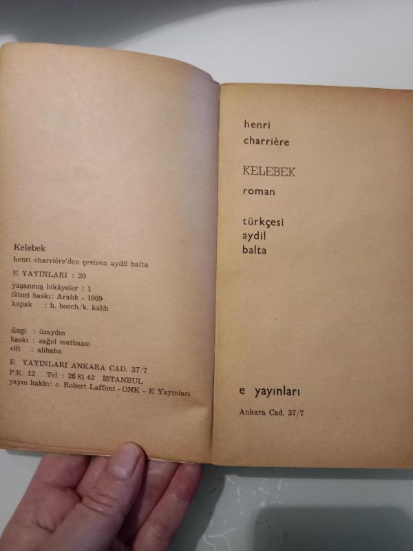 Kelebek, Henri Charriere tarafından kaleme alınmıştır. Kitap 1969 yılında E Yayınları tarafından [İstanbul] yayınlanmıştır. Satışta olan kitap, yayınevinin 2. baskısıdır. Bu baskının çevirisi Aydıl Balta tarafından yapılmıştır. 620 sayfadır. Kelebek adlı eser Türkçe dilindedir.