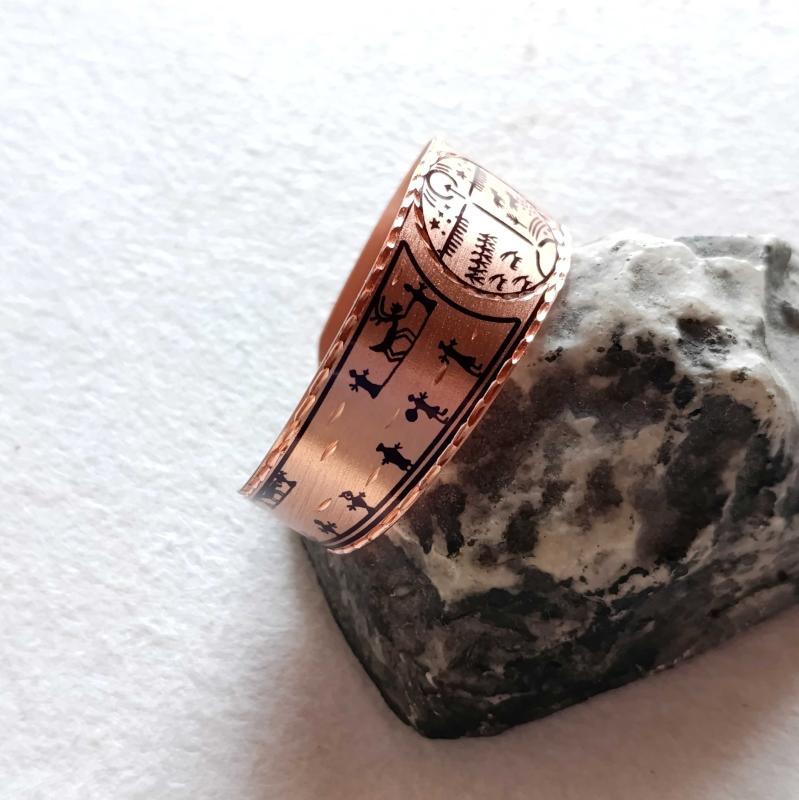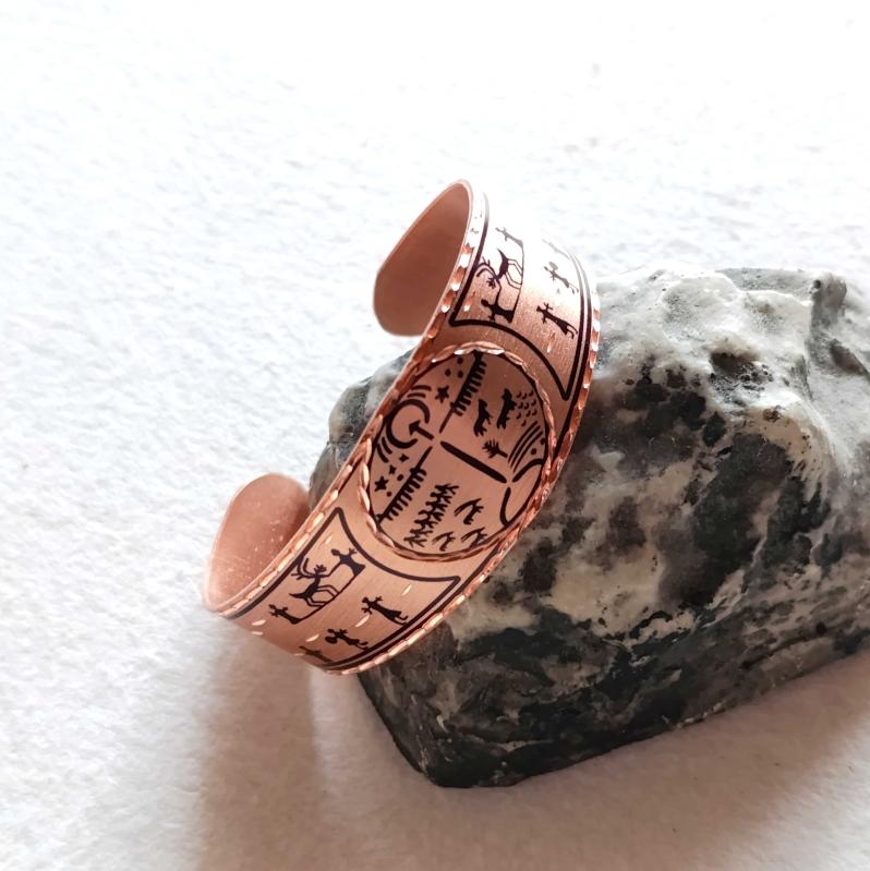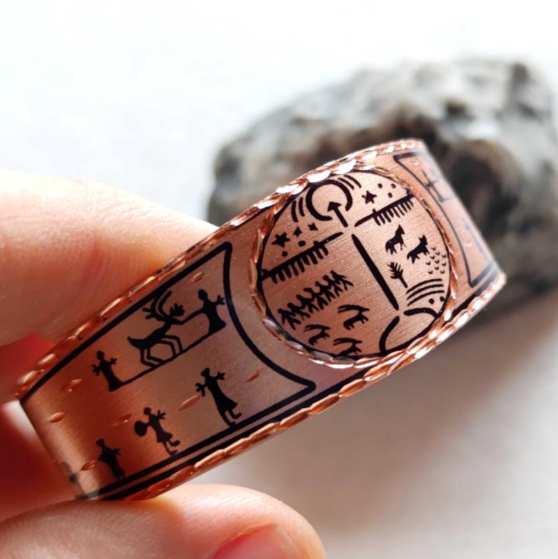 Kelepçe Bakır bilezik , Elyapımıdır, Özel tasarımımdır. Kam davulu ve Şaman desenleri başlıklı antika/koleksiyon objesi Türkiye menşe’lidir. 2000 ve sonrası dönemine aittir.