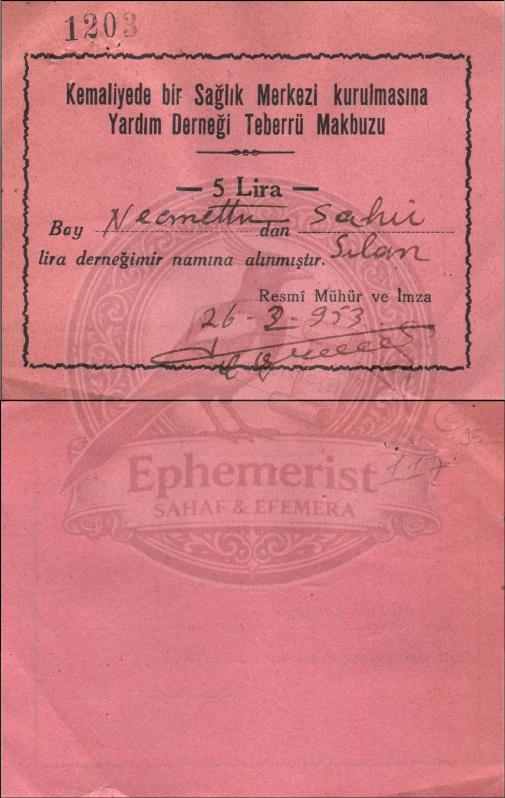 Kemaliye Sağlık Merkezi yardım makbuzu. Necmettin Sahir Sılan adına. (Orijinal Belge, Pembe, 1953, 9x14 cm.), en son bir ay önce güncellenmiştir.