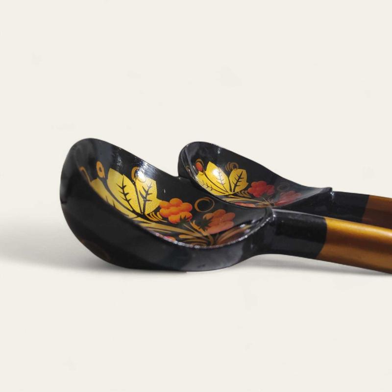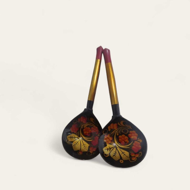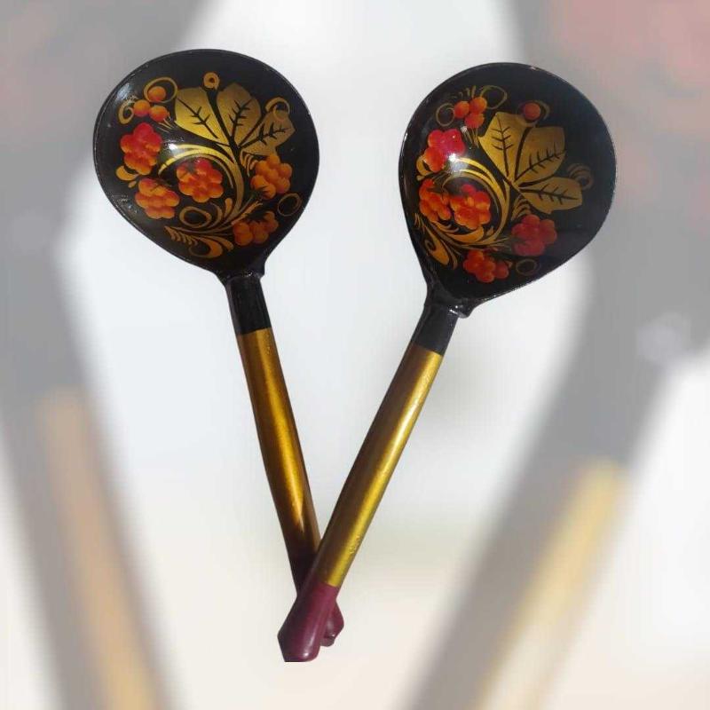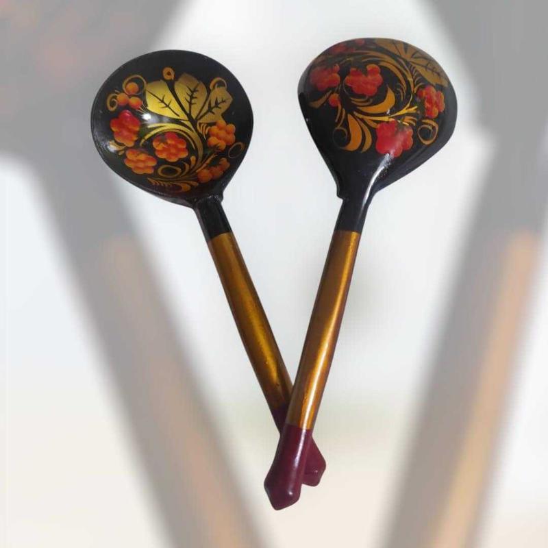 Khokhloma Stili Ahşap El Boyama Servis Kaşığı 2 adet başlıklı antika/koleksiyon objesi Rusya menşe’lidir. 1900 öncesi dönemine aittir.