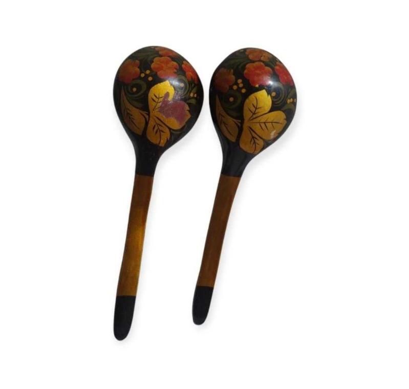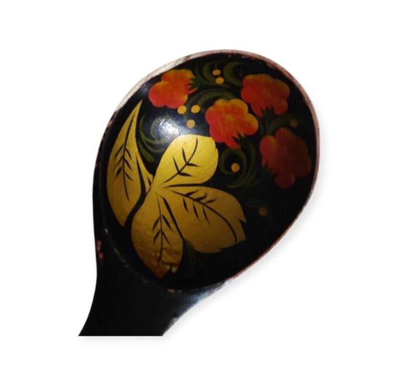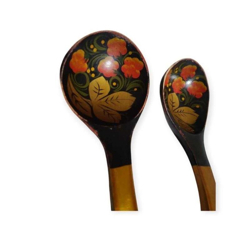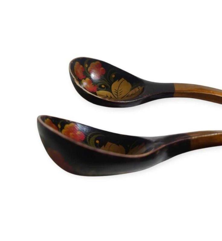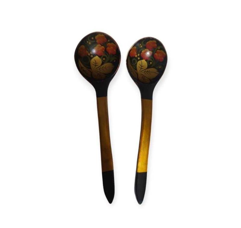Khokhloma Stili Ahşap El Boyama Servis Kaşığı 2 adet başlıklı antika/koleksiyon objesi Rusya menşe’lidir. 1900 öncesi dönemine aittir.