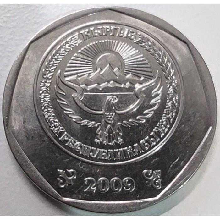 2009 Emisyonu Tarihçesi: Bu 10 Som, Kırgızistan'ın kağıt paralardan madeni paralara geçiş yaptığı tarihi 2008-2009 serisinin en büyük birimidir. Ön yüzünde paranın değeri olan "10" rakamı, geleneksel Kırgız deri su kabı olan "Köökor" motifiyle çevrelenmiştir. Arka yüzünde ise Kırgızistan Devlet Arması yer alır. 2009 yılı basımlarında kenar yazısının bulunmaması (düz kenar), paranın modern ve minimalist tasarımını vurgulayan teknik bir detaydır. Koleksiyon Değeri ve Estetik: Nikel kaplı çelikten üretilen bu para, yüksek parlaklığı ve tokluğu ile bilinir. Kırgız nümismatiği, Türk dünyasının kadim desenlerini modern darphane teknikleriyle birleştirme konusunda oldukça başarılıdır. Görseldeki paranın "Köökor" desenindeki ince çizgileri ve devlet armasındaki güneş ışınlarını bu denli temiz korumuş olması, onu "Türk Cumhuriyetleri" veya "Geleneksel Orta Asya Sanatı" temalı koleksiyonlar yapan seçkin koleksiyonerler için arşivlik bir parça kılar.
