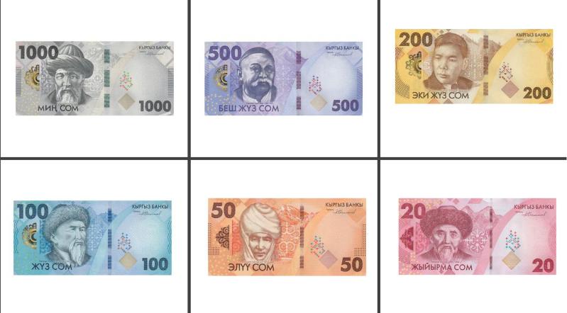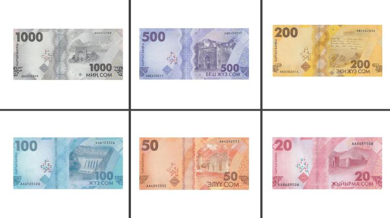 Kırgızistan 1000-500-200-100-50-20 Som, Çil, Blok balyadan çıkma Tam Tedavüldeki banknot takımı, 1 yıl önce satışa sunulmuştur.